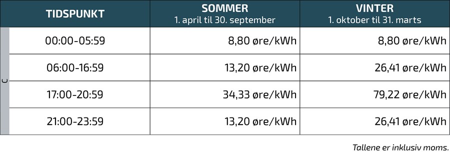 Værd er det særligt at lægge mærke til forskellen på prisen i tidsrummet 17.00 til 20.59. Her er tale om mere end en fordobling fra sommer til vinter.