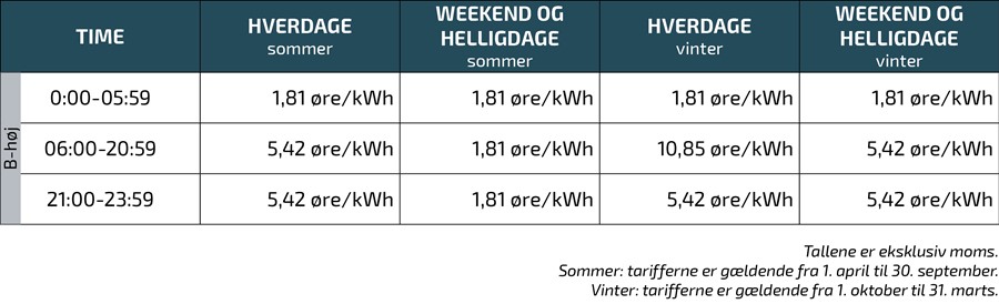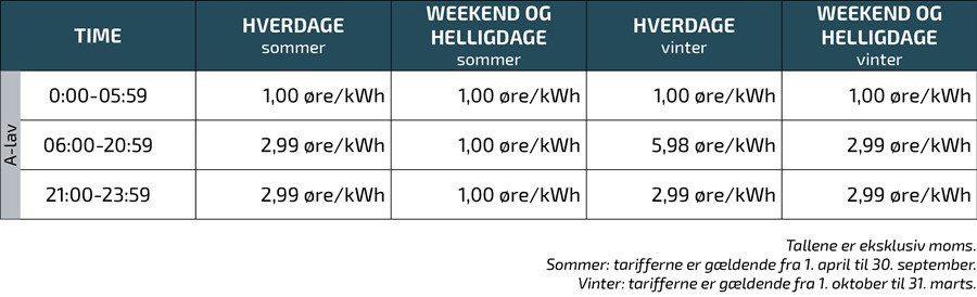 Værd er det særligt at lægge mærke til forskellen på prisen i tidsrummet 17.00 til 20.59. Her er tale om mere end en fordobling fra sommer til vinter.